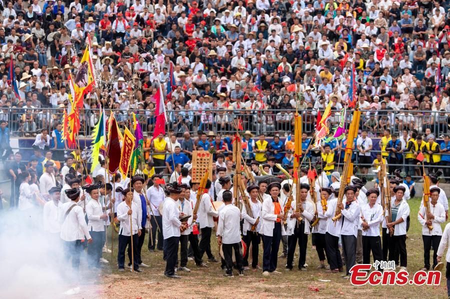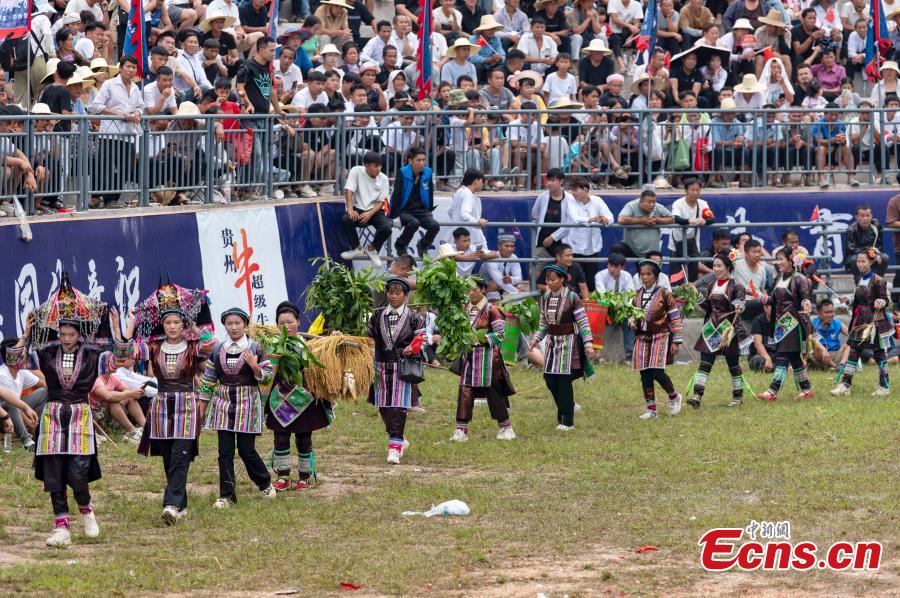 People perform to celebrate harvest in Congjiang County, Qiandongnan Miao and Dong Autonomous Prefecture, Guizhou Province, Sept. 20, 2025. (Photo provided to China News Service)