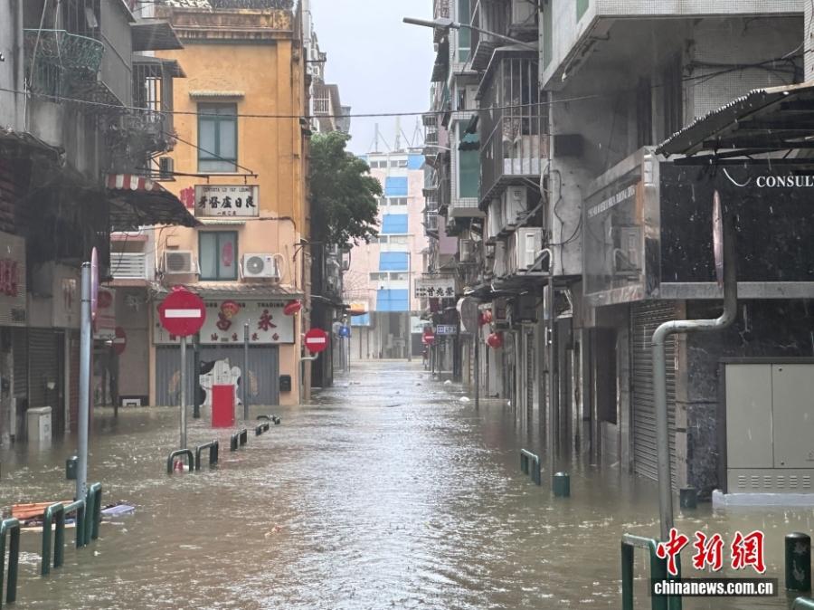 Photo taken on Sept. 24, 2025 shows the flooded Rua do Campo in Macao Special Administrative Region. (Photo: China News Service/Zheng Jiawei)