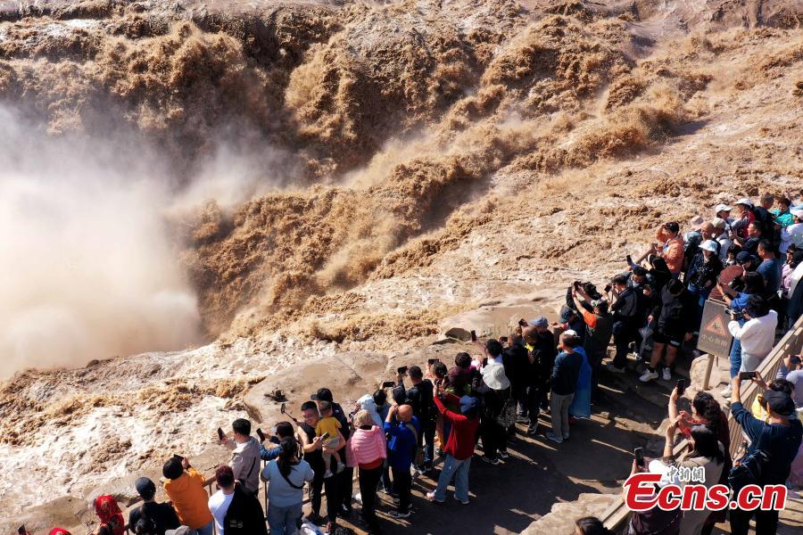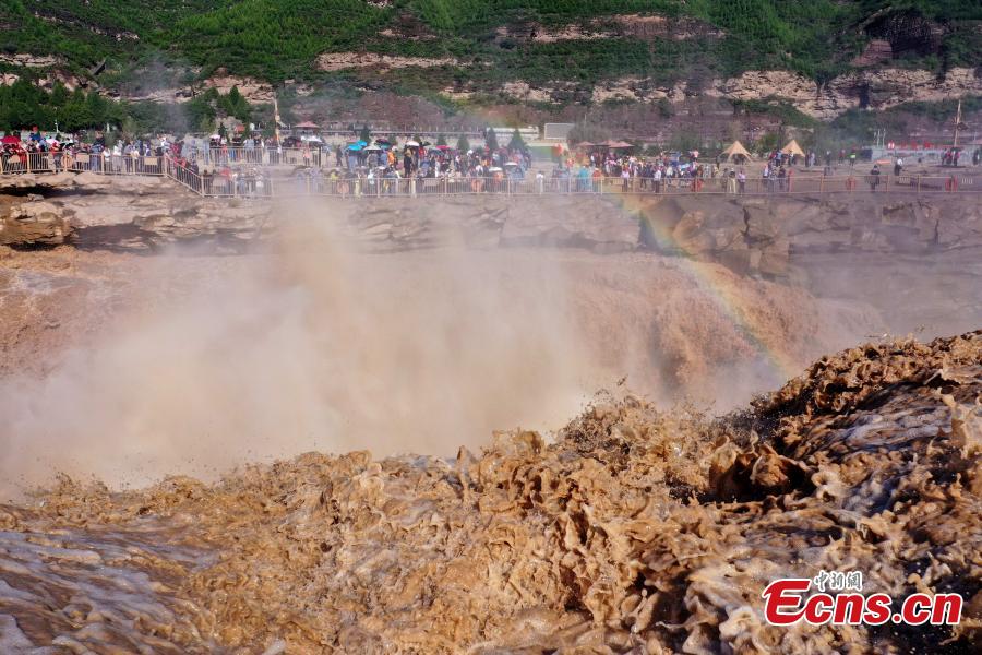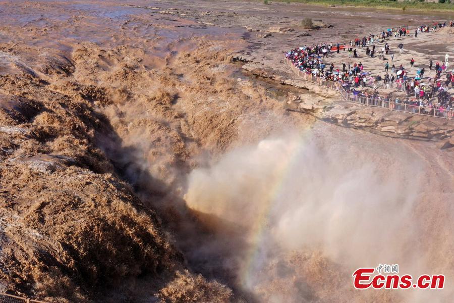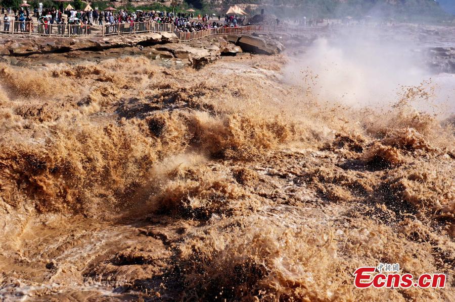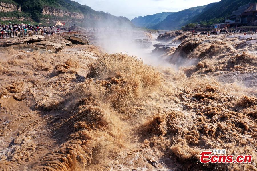 The waterfall is located on the border area between north China's Shanxi and northwest China's Shaanxi provinces. Due to upstream rainfall and regulatory water discharge from reservoirs, the water volume of the waterfall has significantly increased.