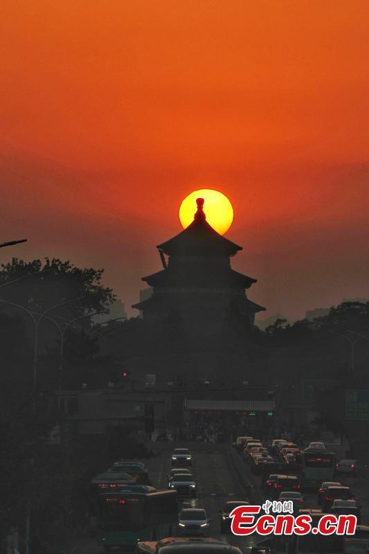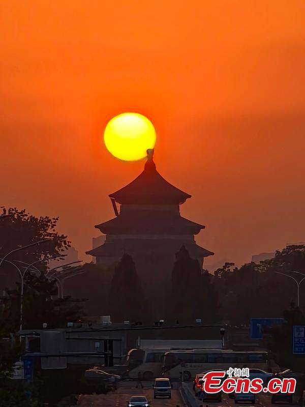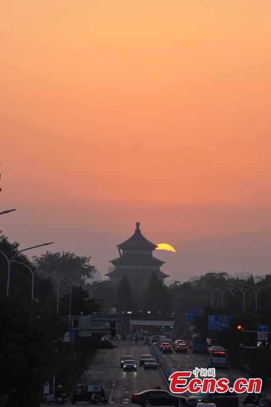 Photo taken on Sept. 24, 2025 shows the spectacle of the “hanging sun” over the Hall of Prayer for Good Harvests at the Temple of Heaven. (Photo: China News Service/Yang Huafeng)