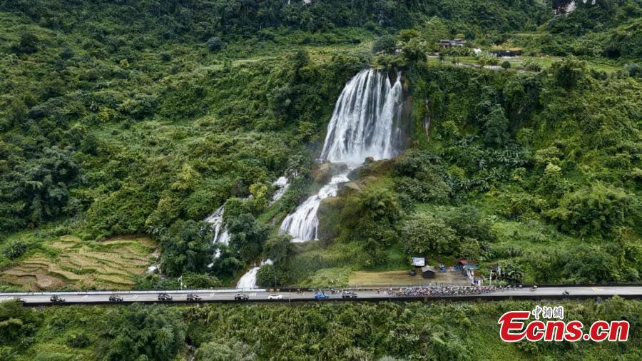 Athletes pass a waterfall during the second stage of the Tour of Guangxi 2025, a six-stage cycling race, in Guangxi Zhuang Autonomous Region, Oct. 15, 2025. (Photo provided to China News Service)