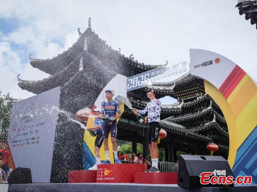 Athletes celebrate with champagne at the awards ceremony in the second stage of the Tour of Guangxi 2025 in Guangxi Zhuang Autonomous Region, Oct. 15, 2025. (Photo provided to China News Service)