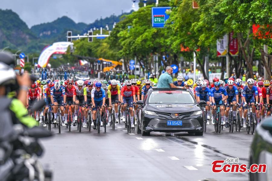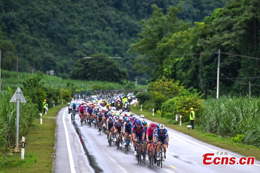 During the Chongzuo-Jingxi stage on Wednesday, cyclists raced through iconic karst terrain, with distinct border culture and Zhuang ethnic elements along the route. The stage distance was cut from 179.6 km to 177.3 km due to natural disasters.
