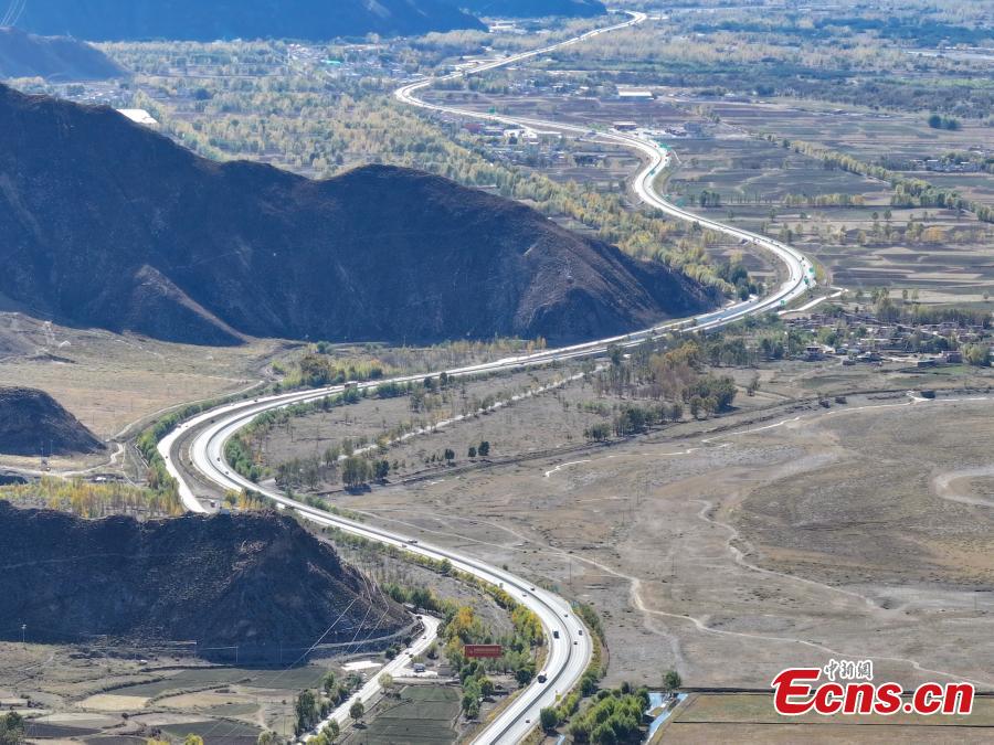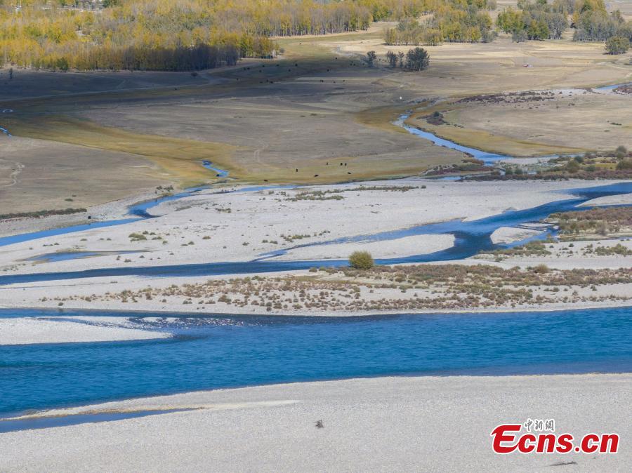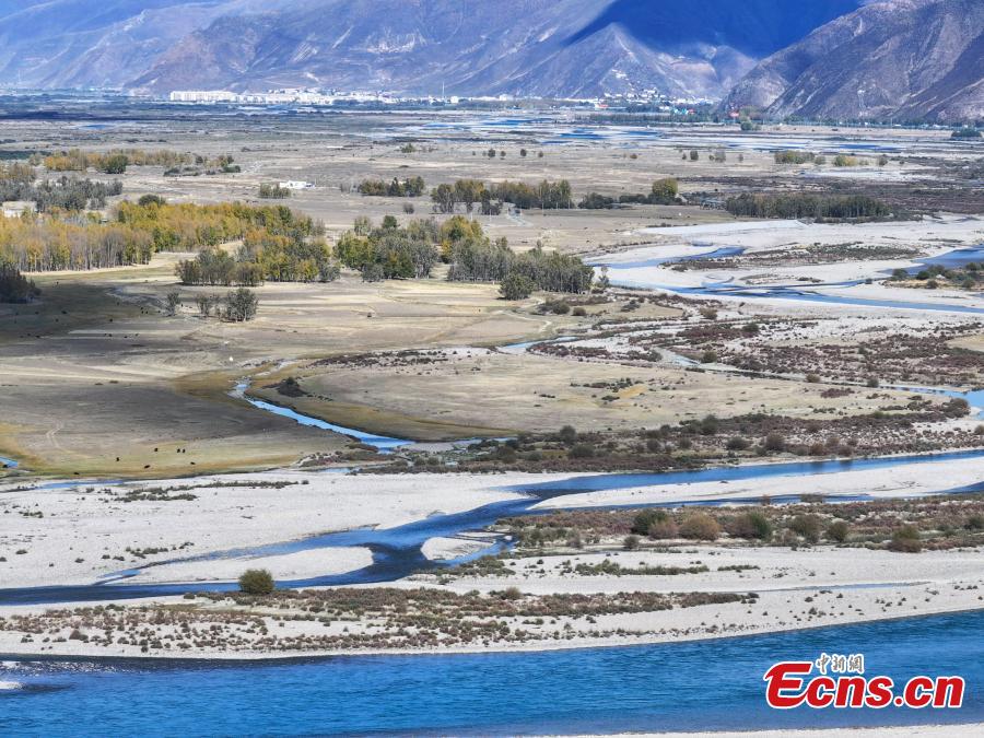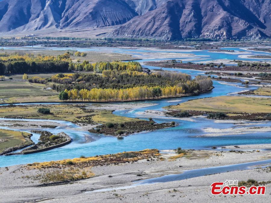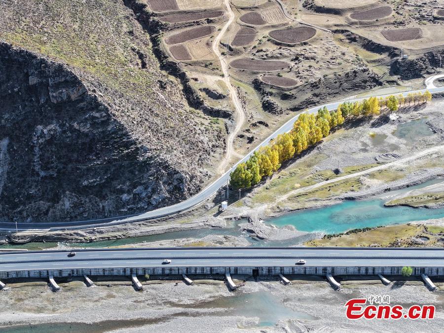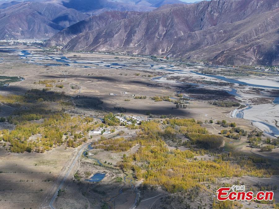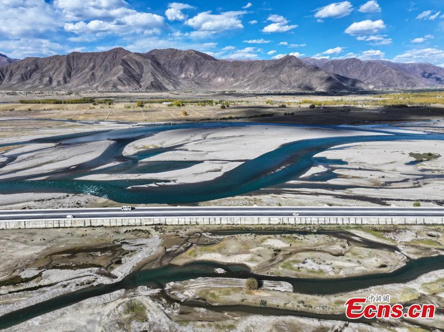 Drone photo taken on Oct. 15, 2025 shows the stunning autumn scenery of Lhasa River in Lhasa, southwest China's Xizang Autonomous Region. (Photo: China News Service/Gongga Laisong)
