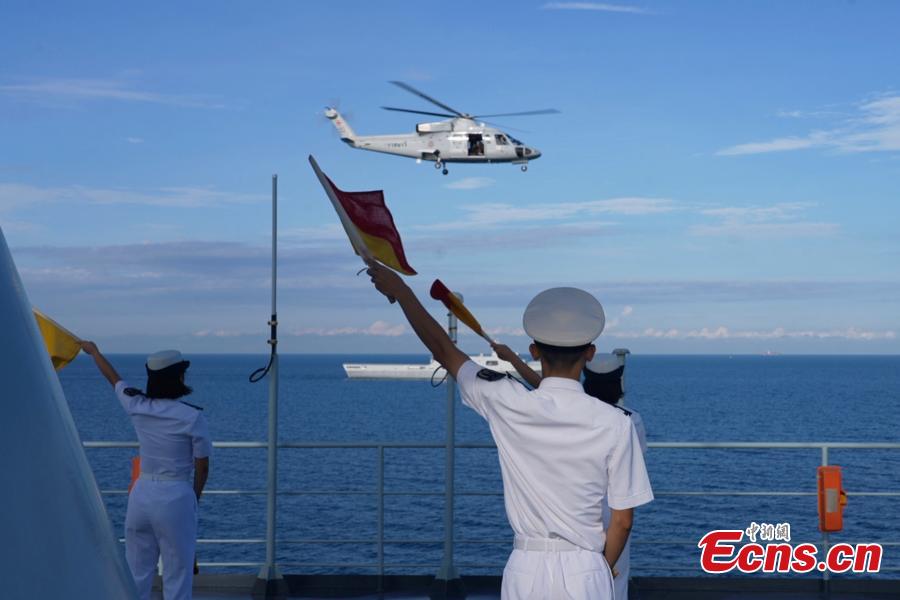 Chinese and Thai naval personnel exchange flag signals to greet each other as the Chinese PLA Navy’s 83rd taskforce arrives at Sattahip Port, Thailand, Oct. 16, 2025. (Photo: Embassy of China in Thailand)