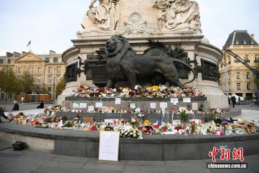 The memorial site set up at Place de la République to commemorate the November 2015 Paris attacks is adorned with flowers, Nov. 12, 2025, local time. (Photo: China News Service/Li Yang)