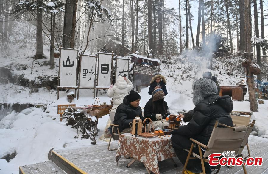 Tourists gather around a stove for warm conversations while brewing tea at the Changbai Mountain scenic area in Jilin Province, Dec. 3, 2025. (Photo: China News Service/Zhang Yao)