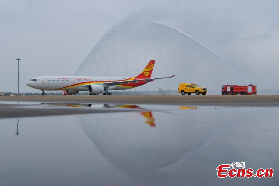 Hainan Airlines’ first A330neo aircraft passes through a water salute at Haikou Meilan International Airport, Nov. 1, 2025.(File photo: China News Service/Luo Yunfei)