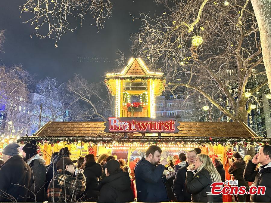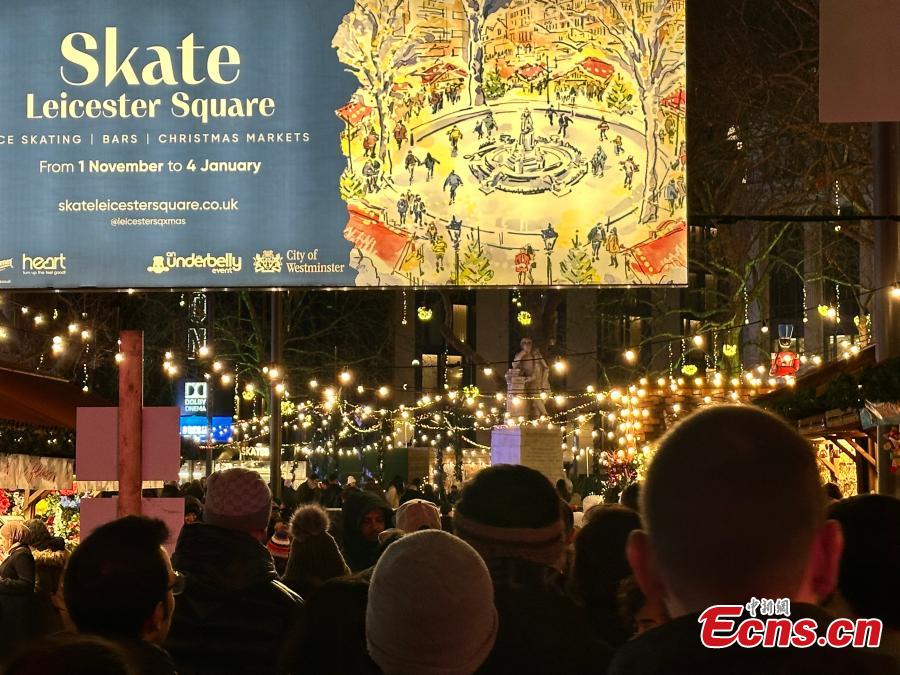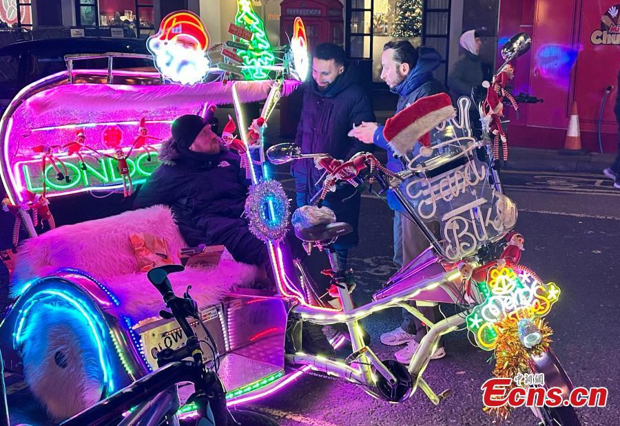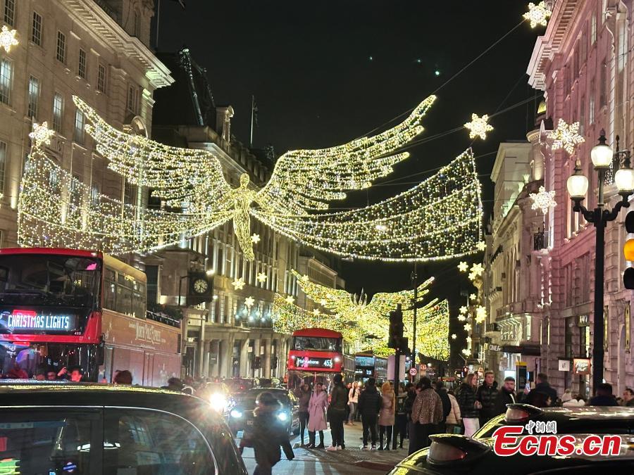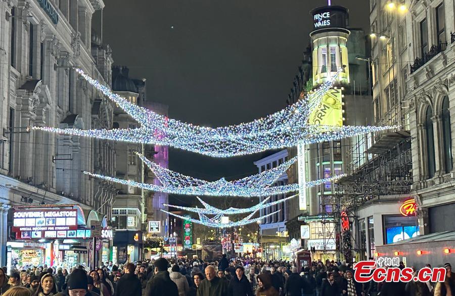 Colorful festive lights illuminate streets near Piccadilly Circus in central London on the evening of Dec. 27, 2025, as crowds of pedestrians gather to welcome the approaching New Year. (Photo: China News Service/Ouyang Kaiyu)