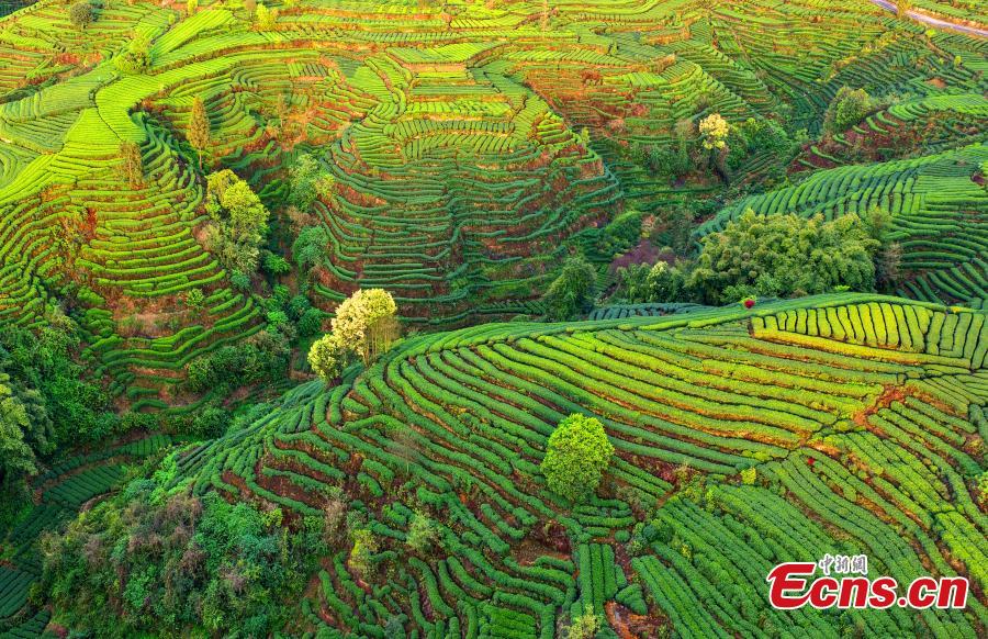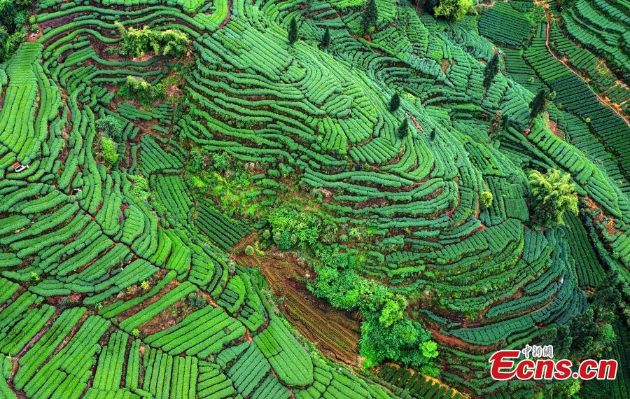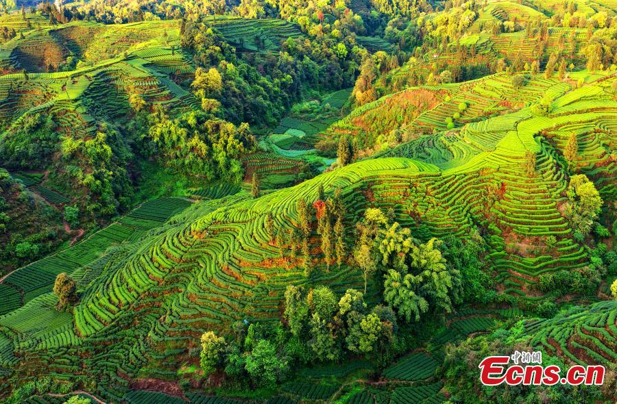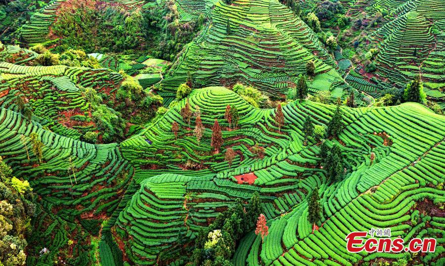 Tea bushes unfurl like the fingerprints of the earth across the Changgangshan Tea Garden in Hongxing Town, Mingshan District, Ya’an City, Sichuan Province, March 31, 2025. (Photo: China News Service/An Yuan)