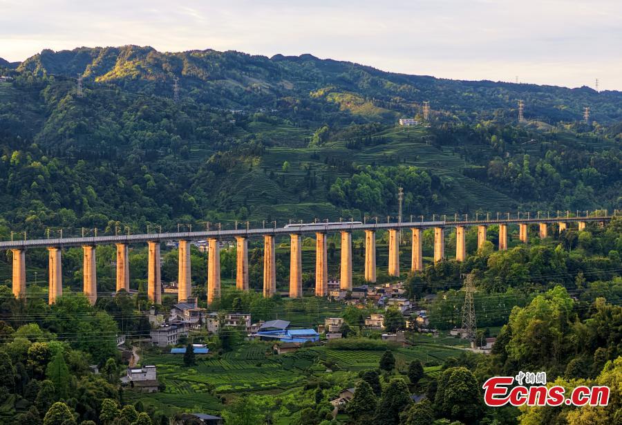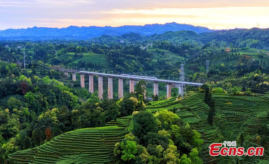 Photo taken on March 31, 2025 shows a high-speed train passing by the Changgangshan Tea Garden in Hongxing Town, Mingshan District, Ya’an City, Sichuan Province. (Photo: China News Service/An Yuan)