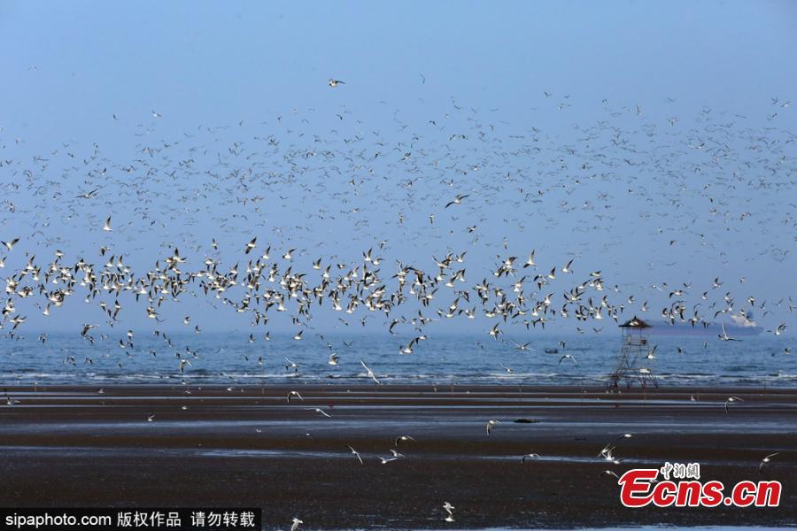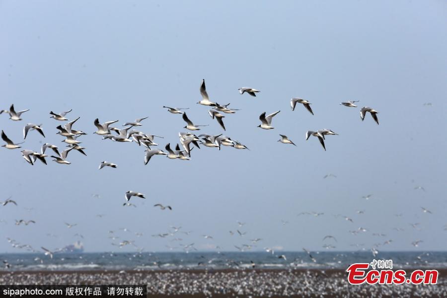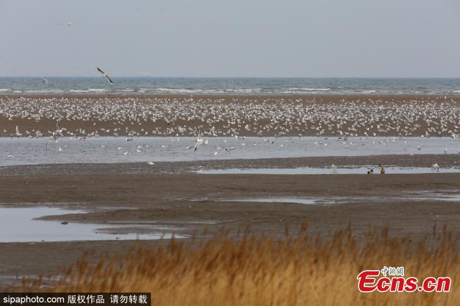 Thousands of white gulls are seen over the Dachaoping Wetland in Beidaihe, Qinhuangdao, Hebei Province, March 30, 2026, forming a magnificent sight. (Photo/Sipaphoto)