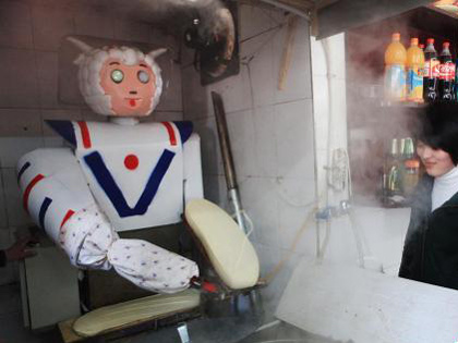 In a noodle shop in Taiyuan, Shanxi Province, a noodle cutting robot in shape of the cartoon character "Pleasant Goat", who wears over-sleeves, is very busy. With the dough held in his hand, his proficiency at slicing the noodles off is as good as, if not better than, the cook beside him. He attracts the attention of many customers, especially the children.