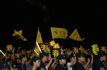 2005年"超级女声"歌唱比赛时,观众席中的粉丝们高举自己亲手制作、写有喜爱选手昵称的牌子.比如,"盒饭"是何洁粉丝团的昵称,李宇春的粉丝团则叫"玉米".