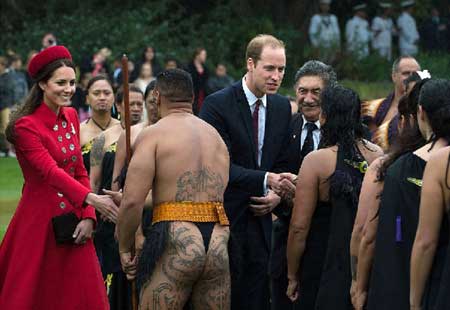 4月8日,一张凯特王妃与露臀“裸男”淡定握手的照片占据了几乎所有英国小报的头版,报道指出,凯特王妃认为新西兰方面安排的毛利传统欢迎仪式实在是“棒极了”。