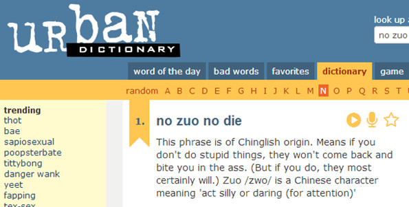 美国在线词典"Urban Dictionary"近日收录"no zuo no die"