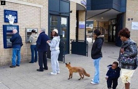 Everyone seems blissfully unaware of the brazen animal apart from one woman warily holding her child outside the Hackney Community College in Hoxton. Following stories of urban foxes in houses and shops, it is not beyond the bounds of possibility that one would join the humans in an ATM queue, and Twitter users obligingly took the picture at face value.