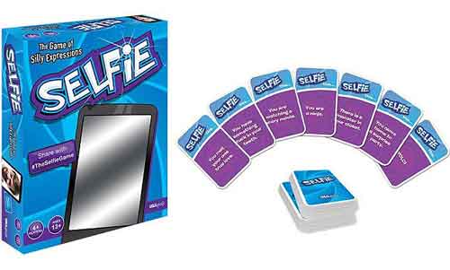 The product description says: 'What does your selfie say about you? Draw a card, take a selfie, then watch as your friends and family guess your expression.