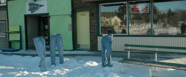 这些冷冻裤造型有点像蹩脚的牛仔裤广告,又有点像恐怖片布景.路人乍看之下为之一愣,细细打量后,却又恍然大悟.
