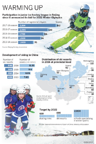 The plan also called for expanding winter sports education to 2,000 schools as part of their PE curriculum by 2022, while Beijing alone has selected 52 schools for a pilot program to offer such training at local rinks and resorts.