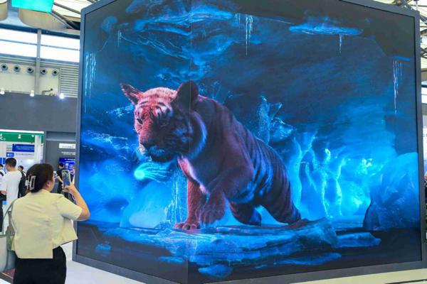 A visitor takes photographs of a 3D screen at the exhibition area of BOE Technology Group Co Ltd during the Display Innovation China Expo in Shanghai on July 4. (Photo provided to China Daily)