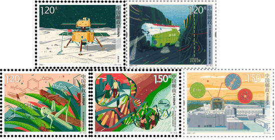 The set contains five special stamps, four of which depict significant achievements that the Chinese Academy of Science led or participated in, including "Chang'e-5", "Fendouzhe (Striver) Deep-Sea Manned Submersible", "Identification of Chemical that Makes Locusts Swarm", and "Decoding Human History with Ancient DNA". The remaining one depicts "Hualong One", a domestically-designed third-generation nuclear reactor.