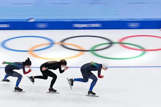 Athletes practice for the Beijing Winter Olympic Games at the National Speed Skating Oval, also known as the "Ice Ribbon," in Beijing, capital of China, Jan. 29, 2022. (Photo: China News Service/He Penglei)