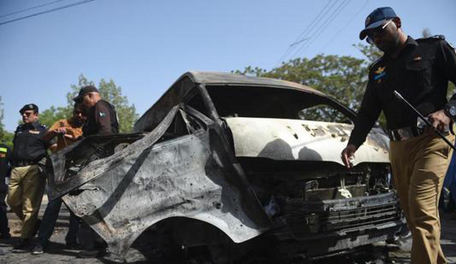 Pakistani police officers and investigators examine a burned van at the site of explosion in Karachi, Pakistan, April 26, 2022. (Photo/Agencies)