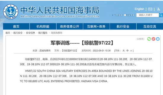 (ECNS) -- China’s Qinglan Maritime Safety Administration issued a warning Monday stating military exercises in some areas of the South China Sea would be conducted from 12 a.m. on Aug. 2 to midnight on Aug 6, with entry prohibited during this time.