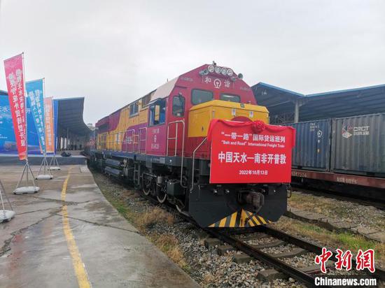 (ECNS) -- A freight train carrying 50 containers of apple juice concentrate departed Tianshui, Gansu Province on Thursday, and headed for Cape Town, South Africa. The freight train will leave China via Qingdao Port in Shandong Province.