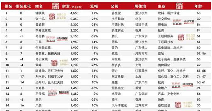 Zeng Yuqun, 54, founder and chairman of Contemporary Amperex Technology Co., Limited, ranks third with 230 billion yuan, 90 billion yuan less than last year, or 28 percent.