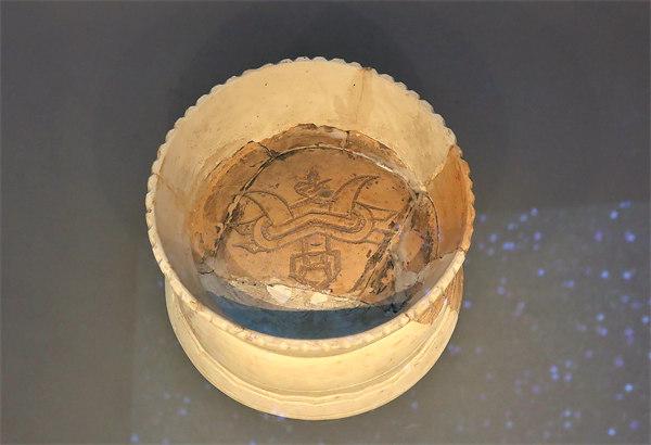 Part of a white pottery vessel with intricate patterns at the Gaomiao site museum. [Photo by Jiang Dong/China Daily]