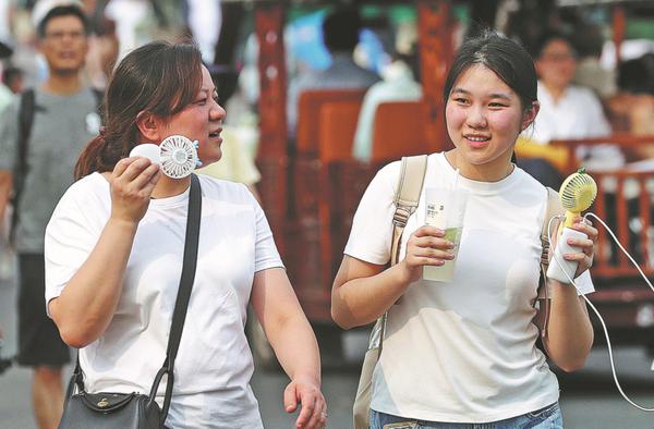 Visitors to the Bai Causeway at West Lake seek relief from the heat wave with fans and cold drinks in Hangzhou, Zhejiang province, on Tuesday. The maximum temperatures climbed to 38.9°C in the main urban area. (Photo by Lin Yunlong/For China Daily)