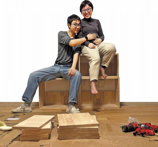Hu and his wife pose for a photo in the middle of building a wooden television cabinet at their apartment in Beijing. CHINA DAILY