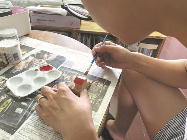 Hu paints a component of a wooden sculpture gift to a friend. CHINA DAILY