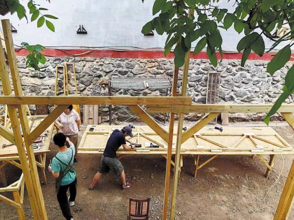 Hu works with professional carpenters to build a wooden pavilion in Miyun last year. (CHINA DAILY)