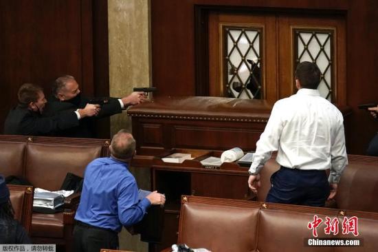 A picture showed officers inside the House chamber drawing their guns near a barricaded door in a standoff with protestors.