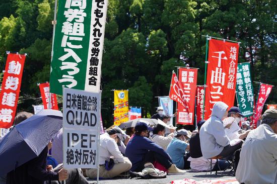 Protesters gather at Shiba Park to demonstrate against the upcoming U.S.-Japan summit and the summit of the Quadrilateral Security Dialogue (Quad), in Tokyo, Japan, May 22, 2022. (Photo: Xinhua/Zhang Xiaoyu)