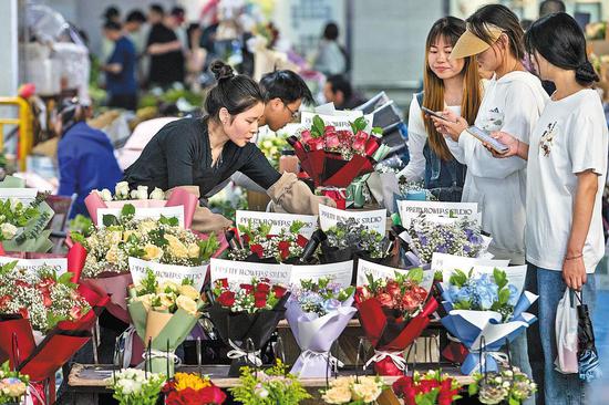 Young women look at flowers on Thursday at a stall in Kunming, Yunnan province, ahead of May 20. (Photo provided to China Daily)
