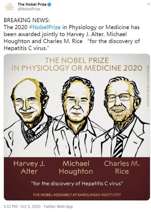 The Nobel Assembly at Karolinska Institutet has today decided to award the 2020 Nobel Prize in Physiology or Medicine jointly to Harvey J. Alter, Michael Houghton and Charles M. Rice "for the discovery of Hepatitis C virus."