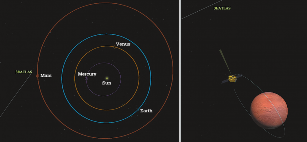 The combo diagram illustrates the relative positions of the interstellar object 3I/ATLAS and the orbiter of China's Mars mission Tianwen 1. The diagram on the right is an enlargement of a section of the diagram on the left. CHINA NATIONAL SPACE ADMINISTRATION