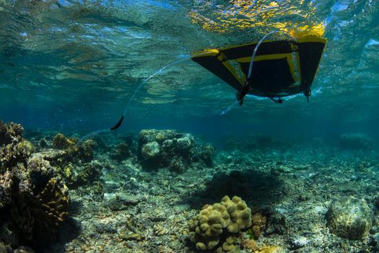Coral reseeding using LarvalBoat. (Photo courtesy of Great Barrier Reef Foundation)