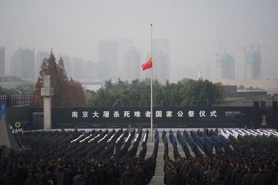 China's national flag flew at half-mast to mourn the Nanjing Massacre victims as sirens blared in the city. On the streets, drivers parked their cars and honked while the pedestrians stood still. A one-minute silence was observed.