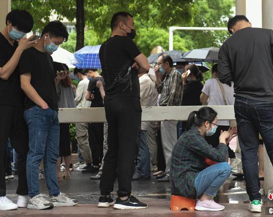 Residents are in a queue for vaccination against the COVID-19 amid the rain at a vaccination site in China's Anhui Province, May 15, 2021. (China News Service/Zhang Yazi)