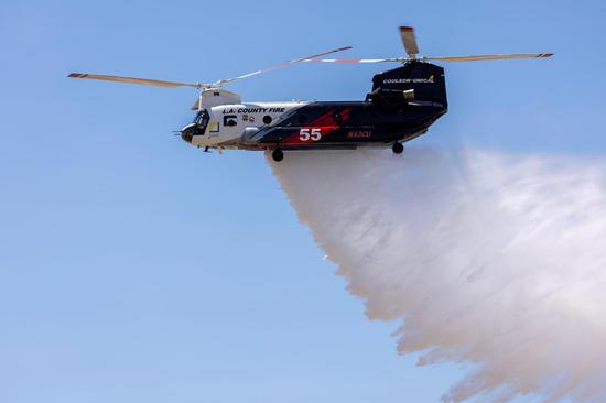 A firefighter helicopter demonstrates a water drop as officials announce a 180-day Quick Reaction Force program designed to help battle wildfires, during a media event at Joint Forces Training Base Los Alamitos in Los Alamitos, California, U.S., June 14, 2021. (photo/Agencies)