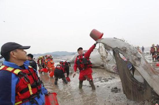 "With the guidance of on-site experts, we kept pouring water on the whale, applied medicine to the injured part and assisted fishery officials to tie ropes to it so the whale could be pulled back to sea when the tide rose," said a rescuer.