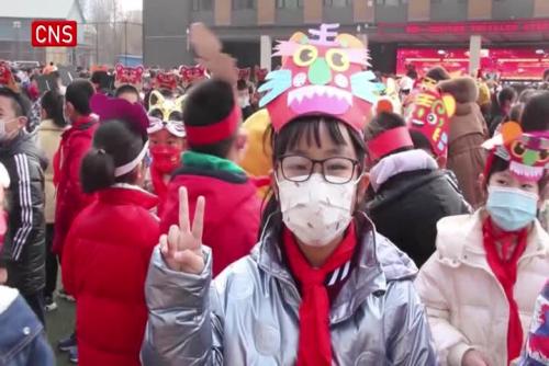 (ECNS) -- Primary students in Lanzhou, Gansu Province, attended their new semester opening Wednesday, wearing tiger-head hats and holding cute little lanterns.