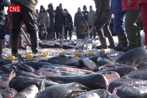 On Wednesday, a winter fishing event was held on the frozen Lianhuan Lake in Mongolian Autonomous County of Dorbod, Daqing City, northeast China's Heilongjiang Province.