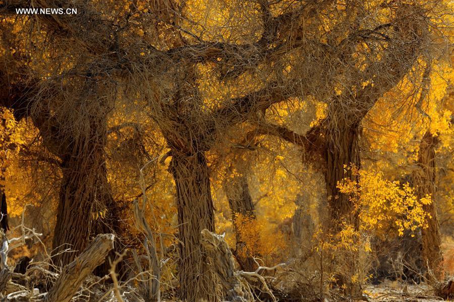 Photo taken on Oct. 25, 2014 shows the forest of populus euphratica, commonly known as desert poplar, in Luntai County, Mongolian Autonomous Prefecture of Bayingolin, northwest China's Xinjiang Uygur Autonomous Region. (Photo: Xinhua/Wang Hanbing)