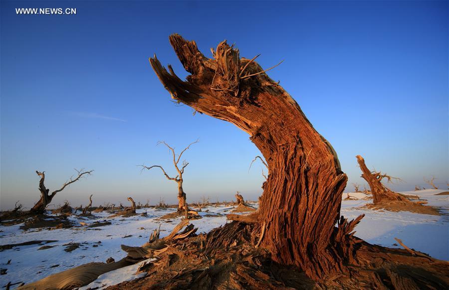 Photo taken on Dec. 23, 2014 shows the forest of populus euphratica, commonly known as desert poplar, in Luntai County, Mongolian Autonomous Prefecture of Bayingolin, northwest China's Xinjiang Uygur Autonomous Region. (Photo: Xinhua/Wang Hanbing)